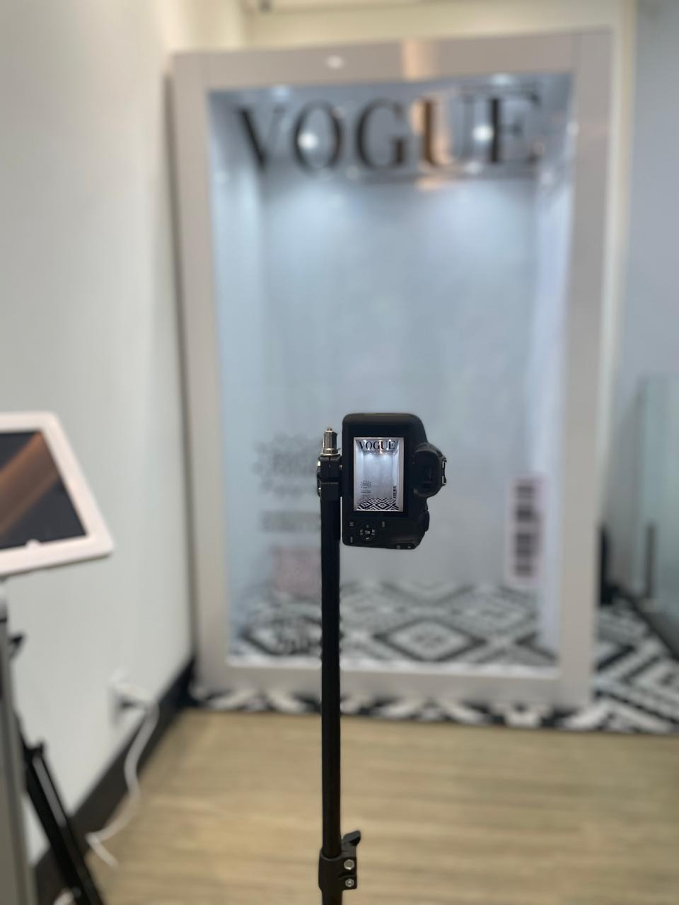 Uma cabine com design minimalista, com iluminação profissional integrada para garantir fotos de alta qualidade.