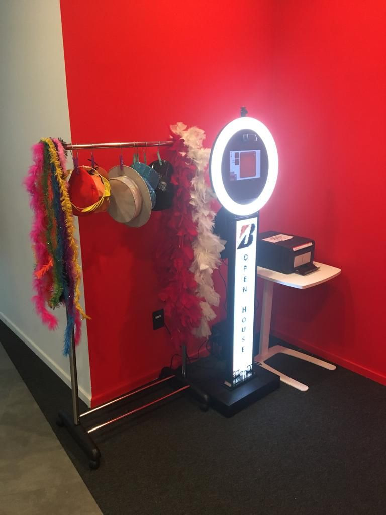 adereços (chapéus, óculos , plaquinhas divertidas) disponibilizados para o evento e em seguida tocam no monitor touchscreen para iniciar a sequência de fotos/poses.